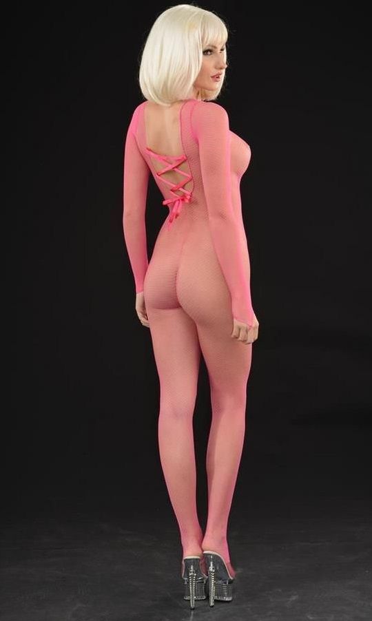 Розовый комбинезон-сетка с красивой шнуровкой на спинке.