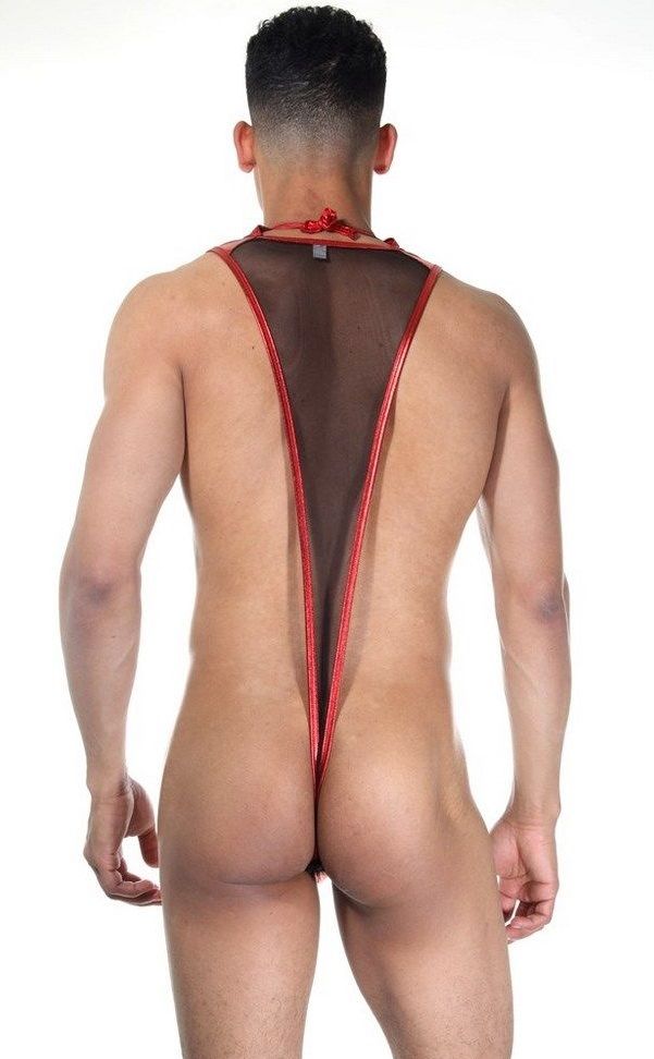 Интересное боди для мужчин, сшитое из двух видов ткани: черной полупрозрачной тонкой сетки и блестящего красного гладкого материала на плечах и в интимной зоне.