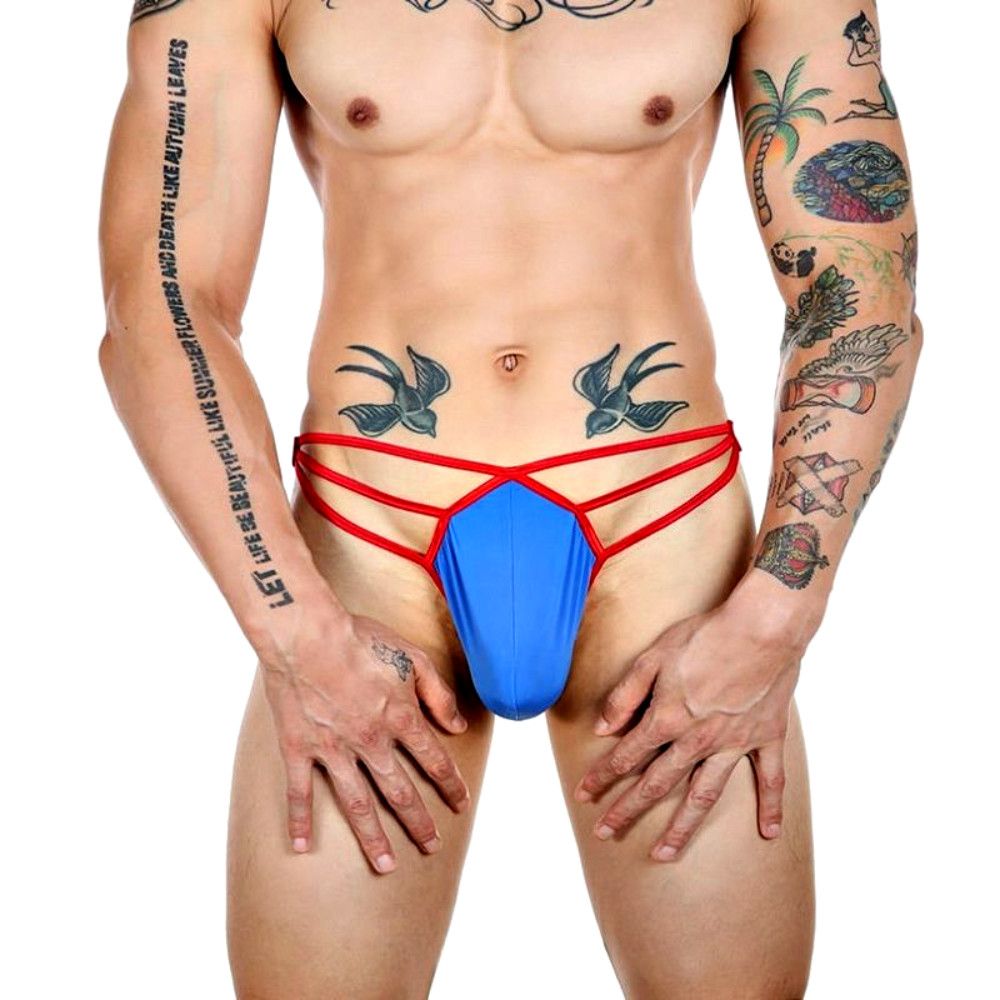 Синие сексуальные трусы-стринги на тонких красных бретелях.