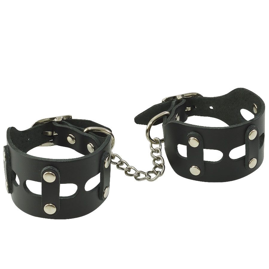 Наручники изготовлены из натуральной кожи. Размер регулируется при помощи металлической пряжки. Наручники соединены цепочкой.