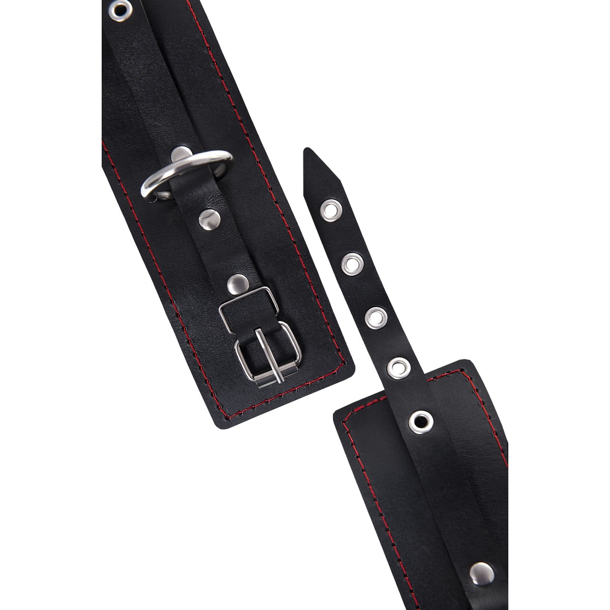 Однослойные кожаные наручники с контрастной строчкой красного цвета могут стать стильным аксессуаром на «свободных» руках, но могут послужить вашим целям и фантазиям по своему прямому назначению. Наличие двух карабинов и колец позволяет использовать изделие как раздельно – аксессуар-манжеты, так и как наручники для фиксации. К широким металлическим кольцам также можно присоединить и другие аксессуары при помощи карабинов. Благодаря универсальному размеру наручники могут использоваться и мужчинами, и женщинами. Размер легко регулируется с помощью металлических пряжек, органично вписывающихся в общий стиль. Длина манжет - 20 см, ширина - 6,5 см. Длина сцепки - 11 см.
