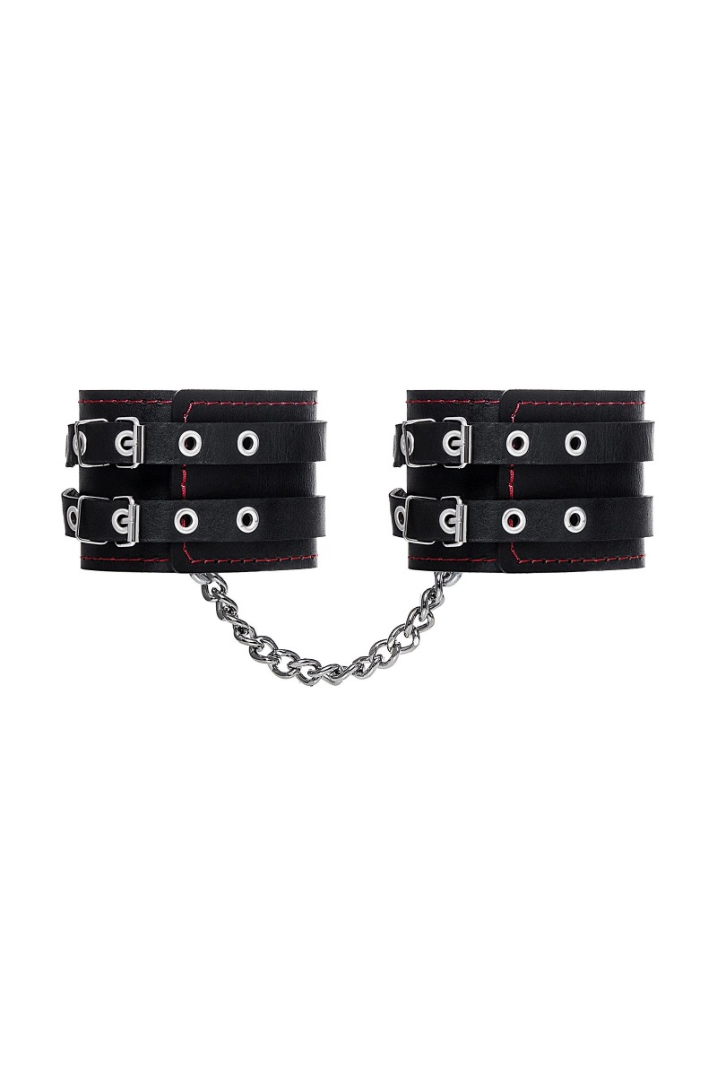 Эти кожаные оковы с двумя ремнями и чёрной подкладкой могут стать стильным аксессуаром, а могут послужить вашим целям по своему прямому назначению. Частичное обездвиживание и невозможность двигать руками или ногами дают вам полную власть над партнером – взрослые игры для взрослых. Наличие двух колец и карабинов, соединенных между собой металлической цепочкой, позволяет использовать изделие как раздельно – аксессуар-манжеты, так и как оковы для фиксации. К широким металлическим кольцам также можно присоединить и другие аксессуары при помощи карабинов. Благодаря универсальному размеру оковы могут использоваться и мужчинами, и женщинами. Размер легко регулируется с помощью металлических пряжек, органично вписывающихся в общий стиль. Длина манжет - 25 см, ширина - 7 см. Длина сцепки - 20 см.