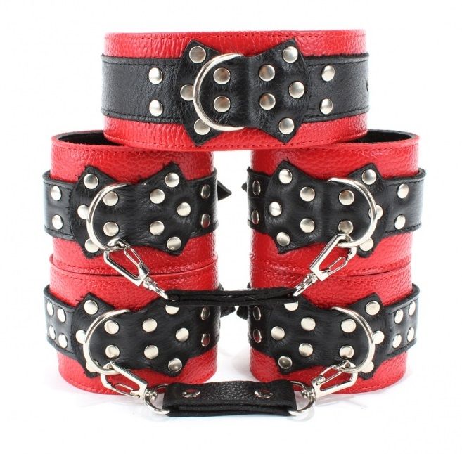 Набор кожаных аксессуаров для истинных ценителей БДСМ-развлечений. В комплекте: ошейник, манжеты для рук и ног.