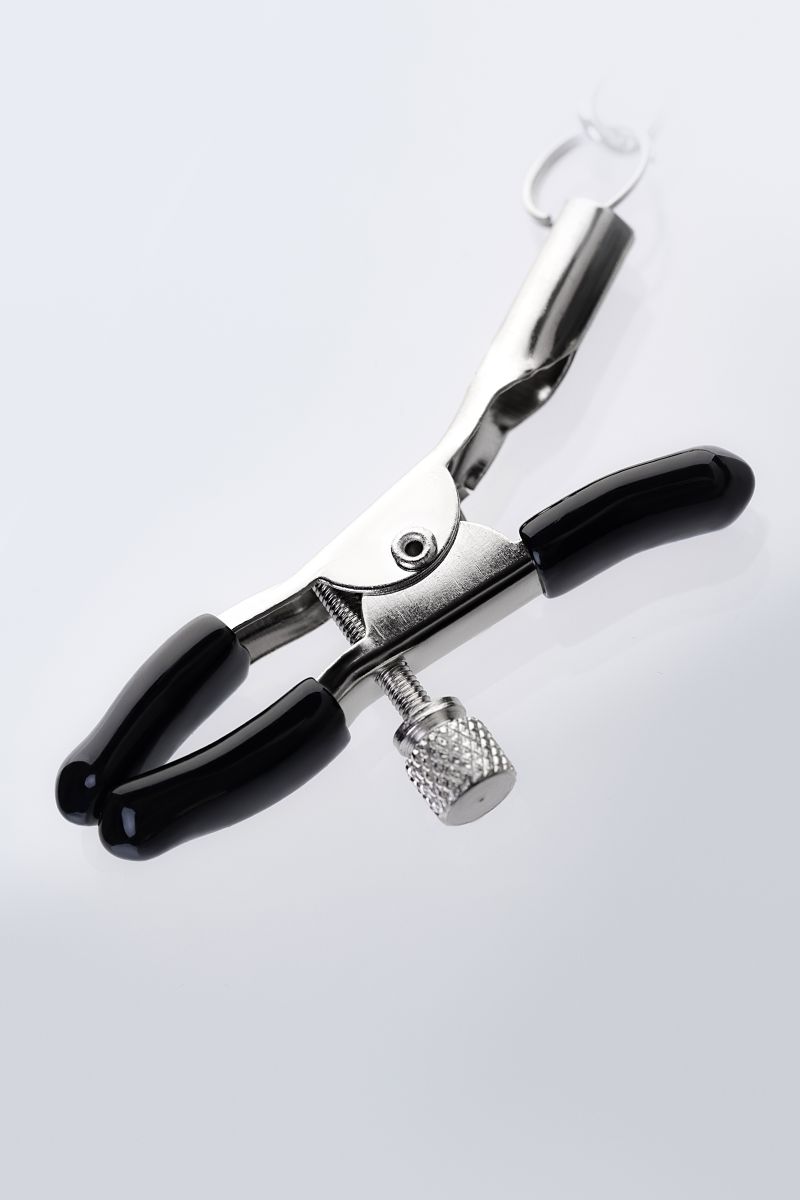 Мужская версия зажимов для воздействия на соски. Сила сжатия регулируется болтиками и может быть усилена или ослаблена во время интимной игры. Дополнительное ограничение свободы обеспечивает металлическое кольцо на пенис. Длина сцепки - 50 см. Длина зажимов - 5 см. Диаметр кольца - 4 см.