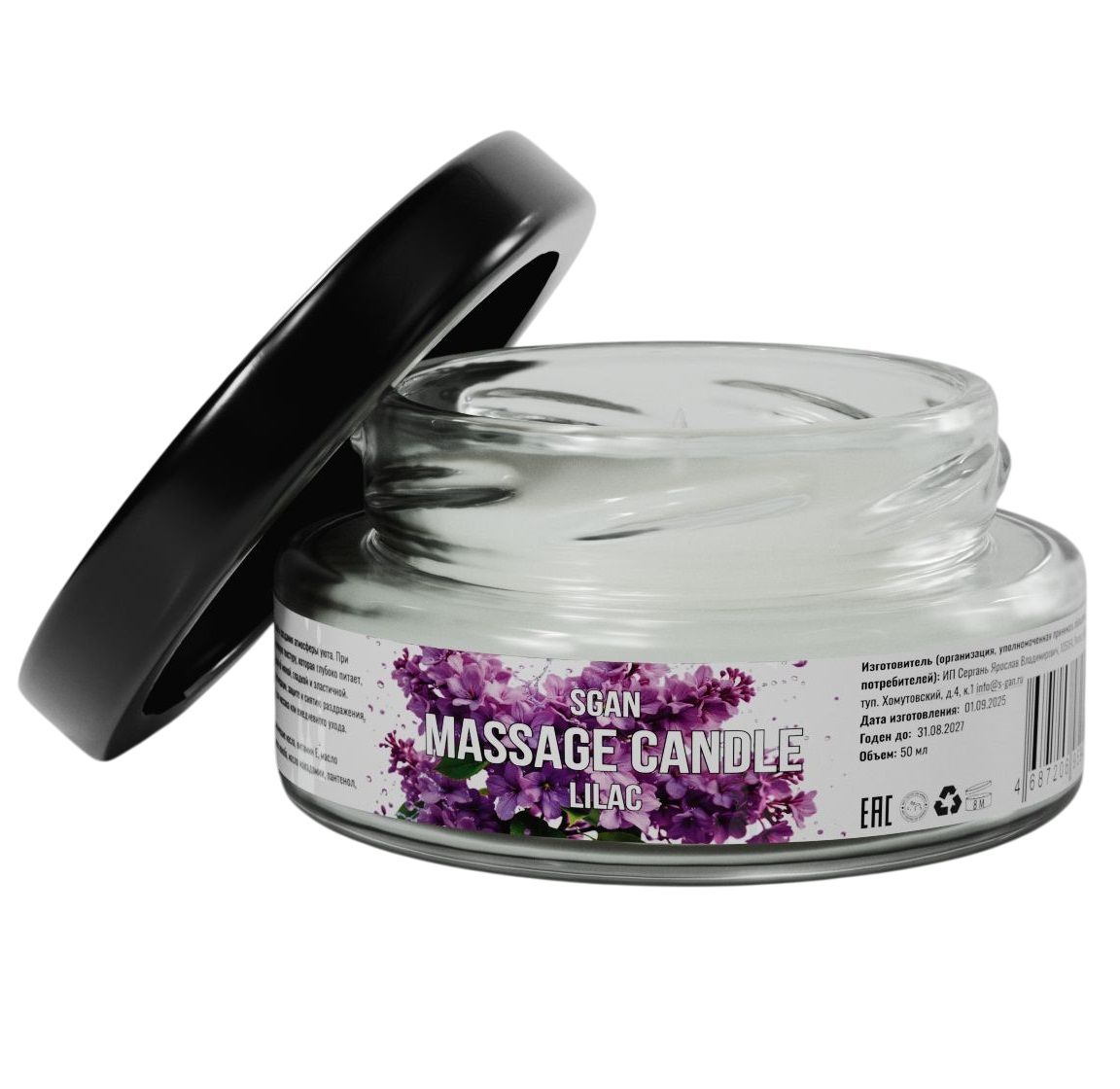 Массажная свеча с ароматом цветущей сирени SGAN в стеклянной банке — это натуральное средство для расслабления, ухода за кожей и создания романтической атмосферы. Свеча изготовлена из 100% кокосового воска с добавлением ароматического масла янтарного мусса и хлопкового фитиля, что обеспечивает безопасное и чистое горение. При нагревании свеча превращается в тёплое массажное масло, которое глубоко увлажняет, питает и смягчает кожу, делая её шелковистой и ухоженной. Приятный аромат цветущей сирени наполняет комнату уютом и гармонией.